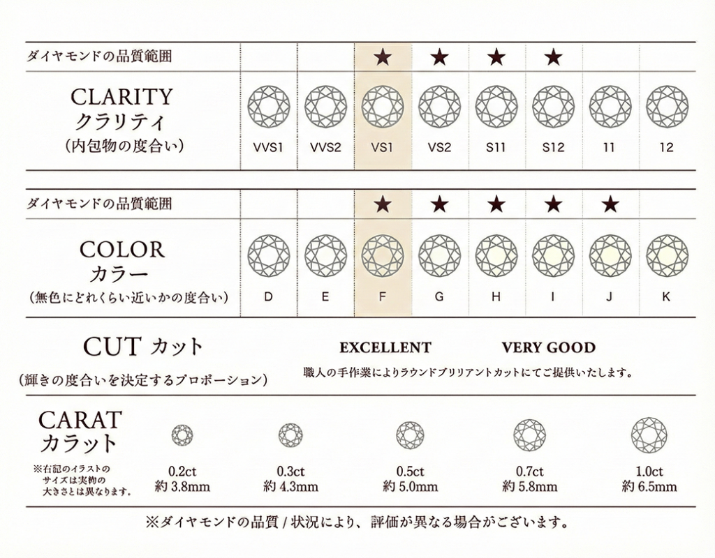※0.2ct(0.18〜0.25ct)、0.3ct(0.28〜0.35ct)