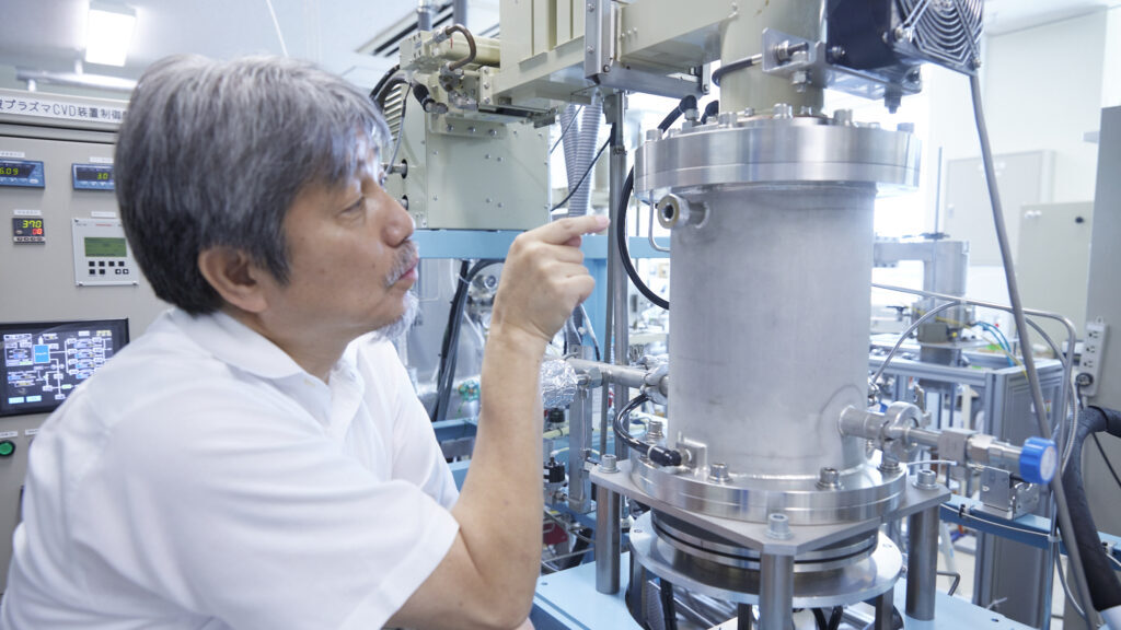 本工程では、薄いダイヤモンドの『種結晶(シード)』をベースに使用します。CVD法(化学気相成長法)により、ガス化した炭素原子をこの種結晶の上に堆積。まるでミルフィーユのように一層ずつ精密に積み上げることで、新しいダイヤモンドを形作ります。